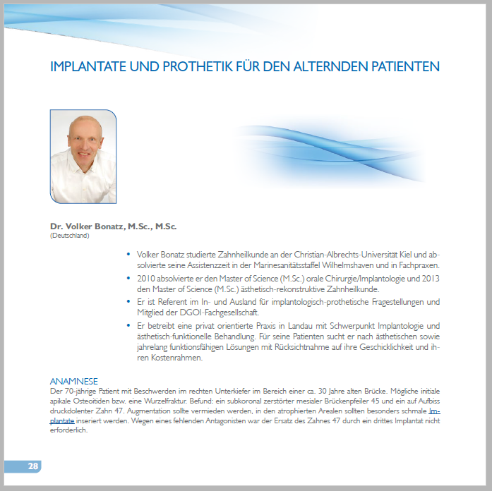 Ein 70-jähriger Patient stellte sich mit Beschwerden im rechten Unterkiefer vor. Eine ca. 30 Jahre alte Brücke zeigte erste Anzeichen eines Versagens. Diagnostiziert wurden eine mögliche apikale Ostitis sowie ein subkoronal zerstörter mesialer Brückenpfeiler 45 und ein druckdolenter Zahn 47.